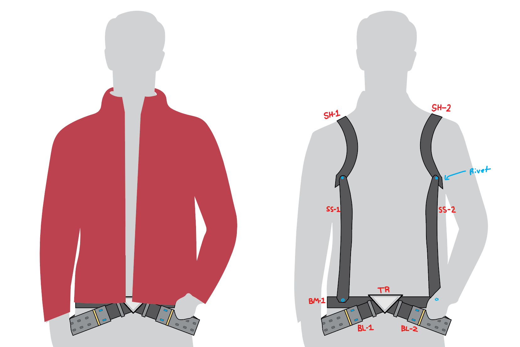 Thus, the scope of this project grew and the next step had to be the harness/holster. I whipped up some ideas on how this could actually be worn for a full day, and tried to create something that would be not only practical, but fit the aesthetic of the character from the game.