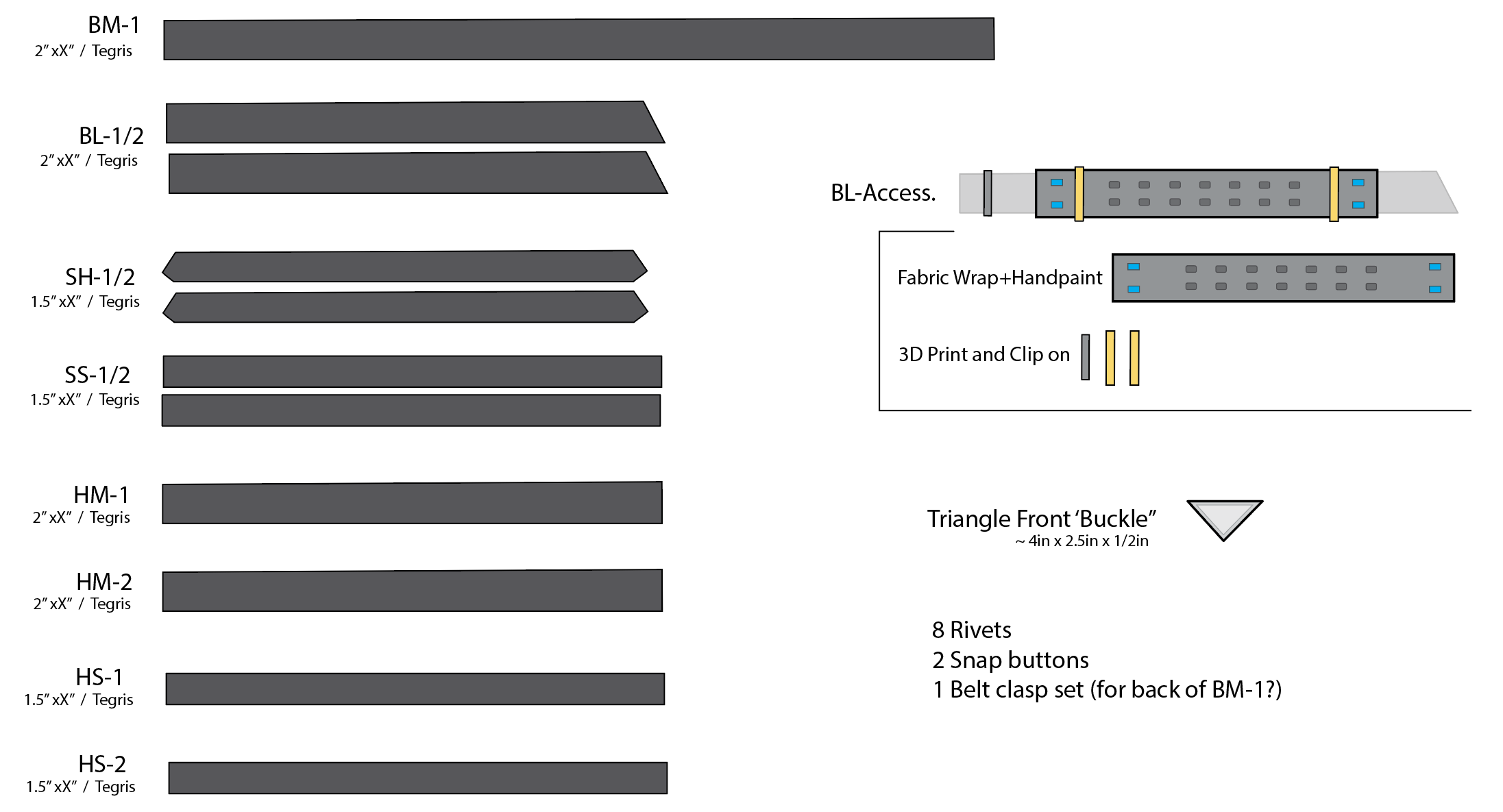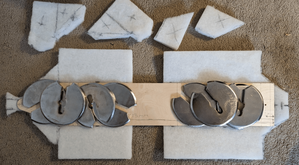 I chose to use Tegris as the main harness material. This is a composite fabric commonly used for gunbelts and has good flexibility in one direction (wrapping around the torso), but remains rigid to downwards force (the weight of the sword). Given that this would be bearing a lot of weight on the hips, I added some thick fabric wraps on the contact areas.
