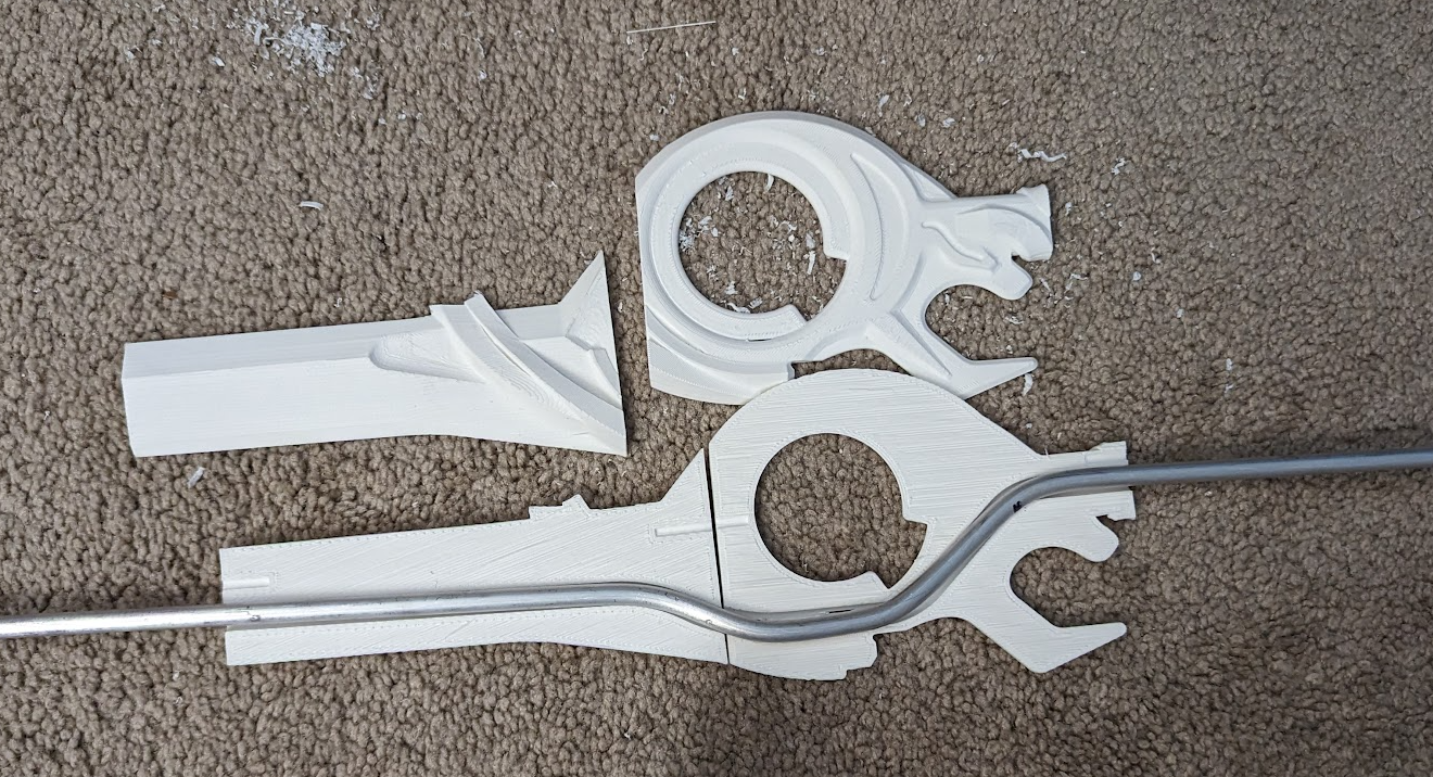My idea at the time was to split the sword into sections, and then embed a 1/4″ aluminum or steel rod, using alignment pins and epoxy to bond it all together. Given it had to be printed in pieces, I was very afraid of the possibility of it breaking at any point, so I wanted it to be as strong as possible. Creating it from one solid piece of wood for example would have some advantages (ignoring the implications of routing, carving, and whittling) but even then, I believed I could make a more durable version using plastic and metal.