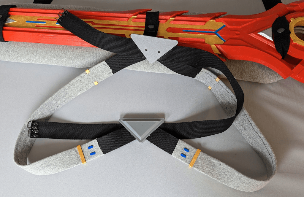 While the most accurate execution was the prop being strapped to the hip, having it slung over the back would be much more comfortable and also reduce the chance of the sword hitting things and people as she was walking around. With that as my goal, and the clock counting down, I devised a back-strap solution that would not only fix the blade in place but also be comfortable for long term wear.